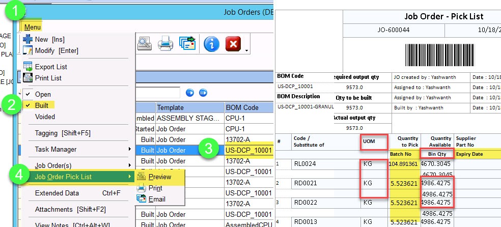 Go to the Job Order List, you can select multiple or one Job Order and view the list of products from the Job Order Pick List