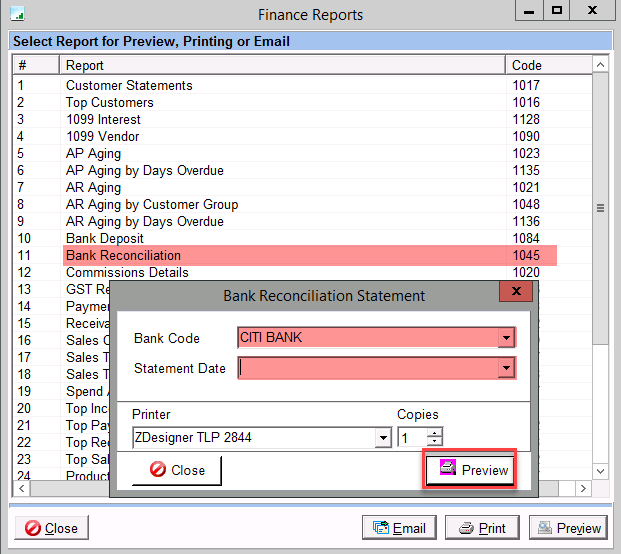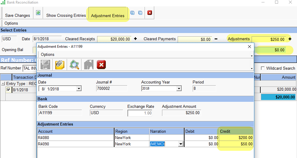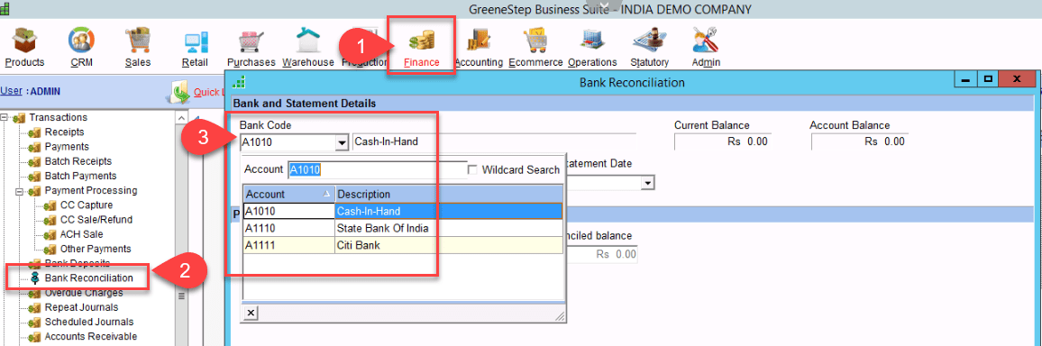 Menu Path: Finance > Transactions > Bank Reconciliation