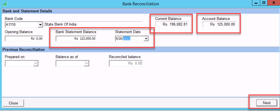 - Enter the Bank Statement Balance and the statement Date and Click on Next