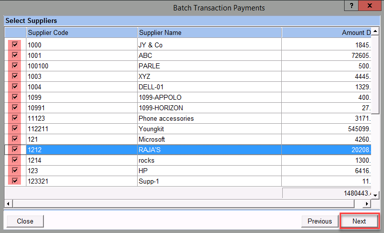 - It displays all the Invoices and Notes of each supplier, to select a transaction for payment