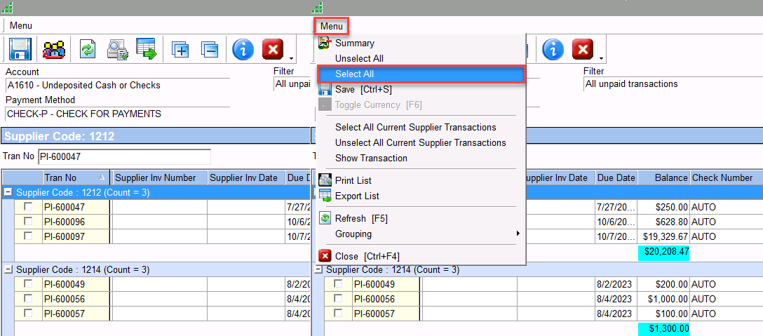 - All transactions can be selected for payment by selecting menu > Select All.
