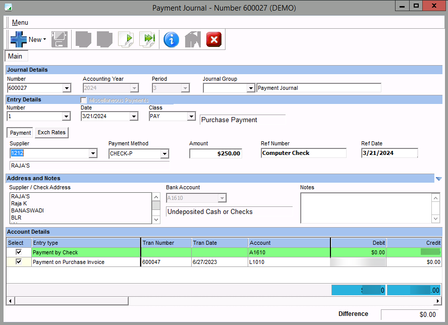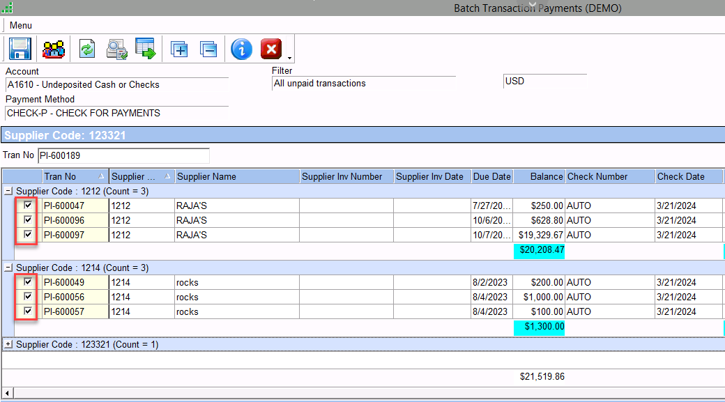 - In the case of manual checks, a transaction is created for all transactions (purchase invoices and debit notes) having the same check number.
