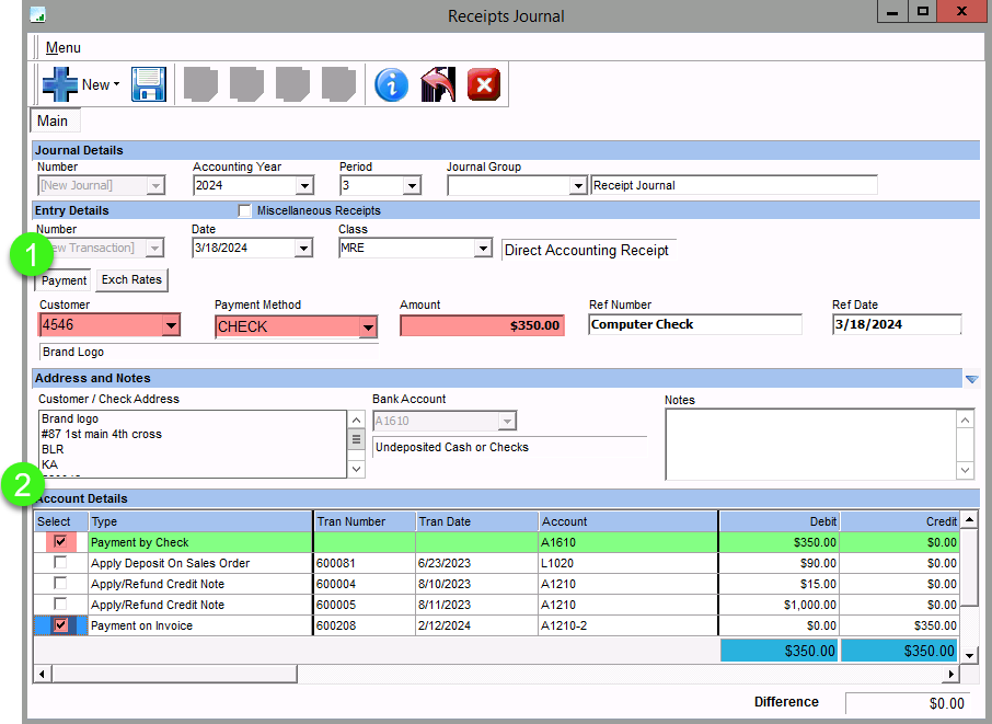 Receipts Journal: If the Customer has paid you the amount by check and wants you to apply it to multiple Sales Transactions.