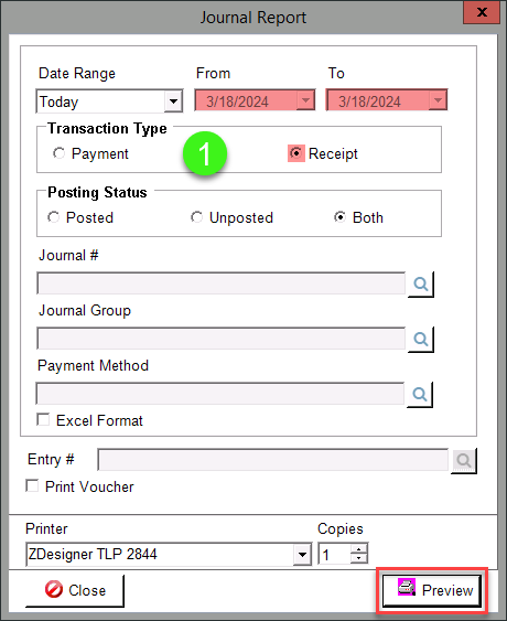 Menu Path: Finance > Reports > Payments or Receipts Journal