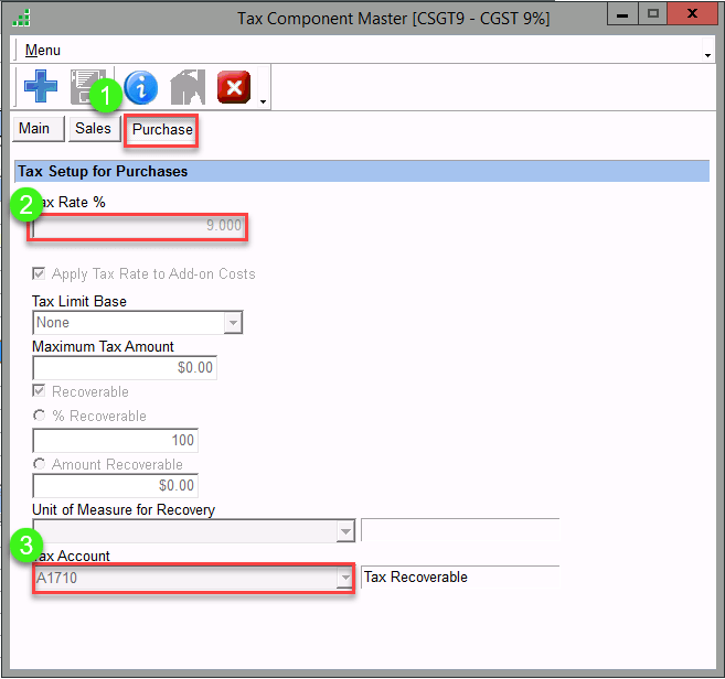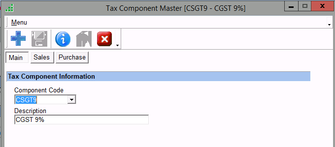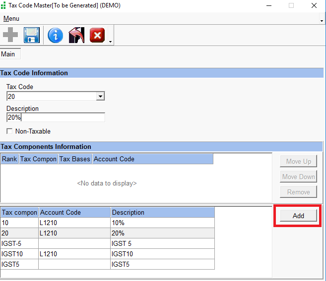 Menu Path: Enter the Tax Code, Description and select the Tax Components to be added for this code click on the ‘Add’ button, and Save