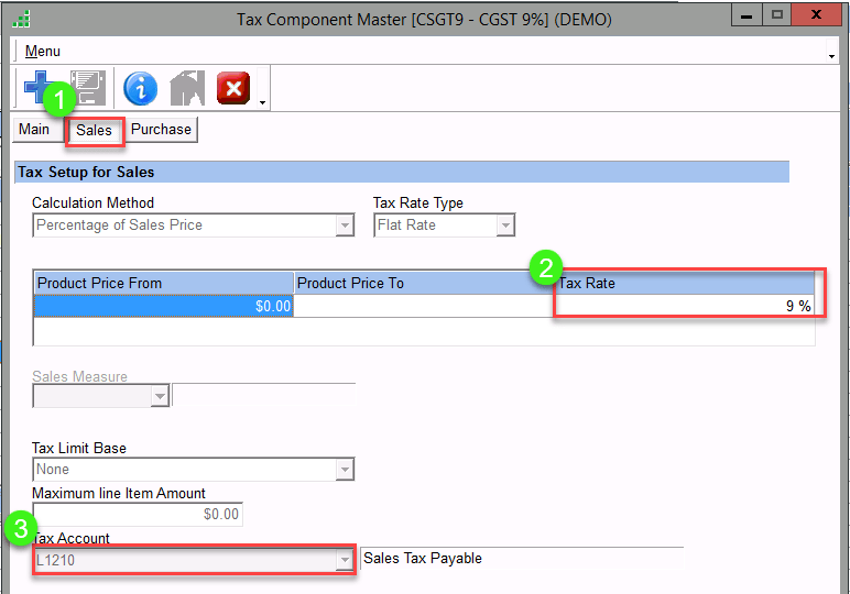 Menu Path: Sales Tab > Enter the Tax Rate and Select the Tax Account