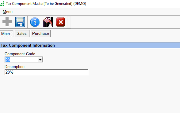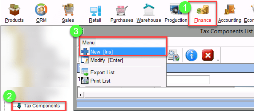 Menu Path: Finance > Tax Components > Tax Components > Tax Components List > Menu > New or Click (+) sign or use the ‘Insert’ key on the keyboard to create a new Tax Component