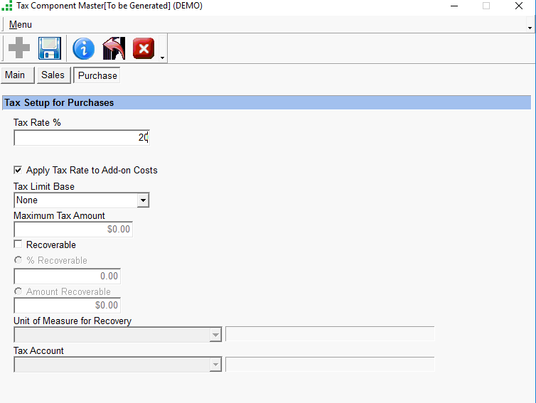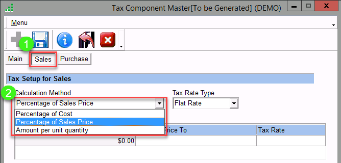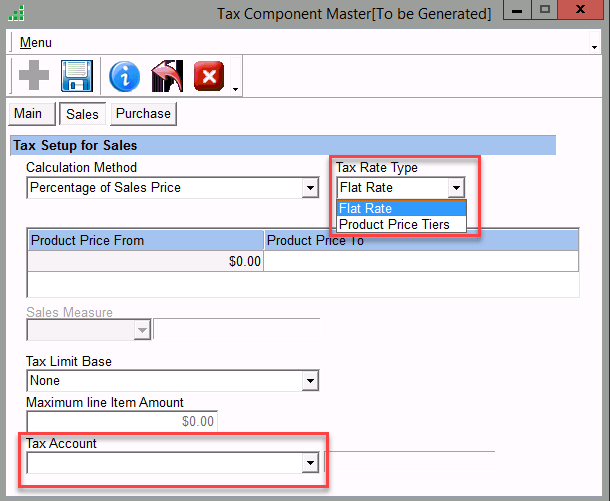 - In the Sales Tab select the Calculation method, Tax Rate type, Tax Account, and other details