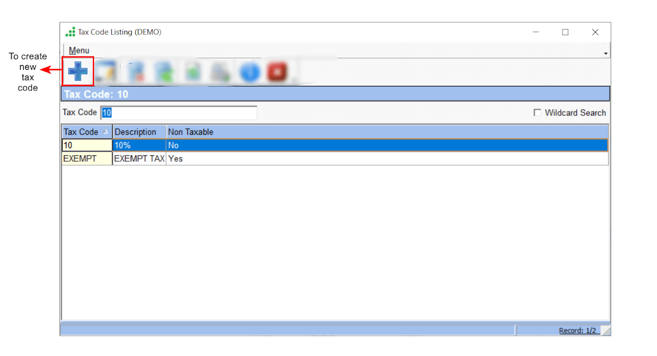 - On the Tax Codes List > Click (+) sign or use the ‘Insert’ key on the keyboard to create a new Tax Code. You can also go to Menu and select ‘New’.