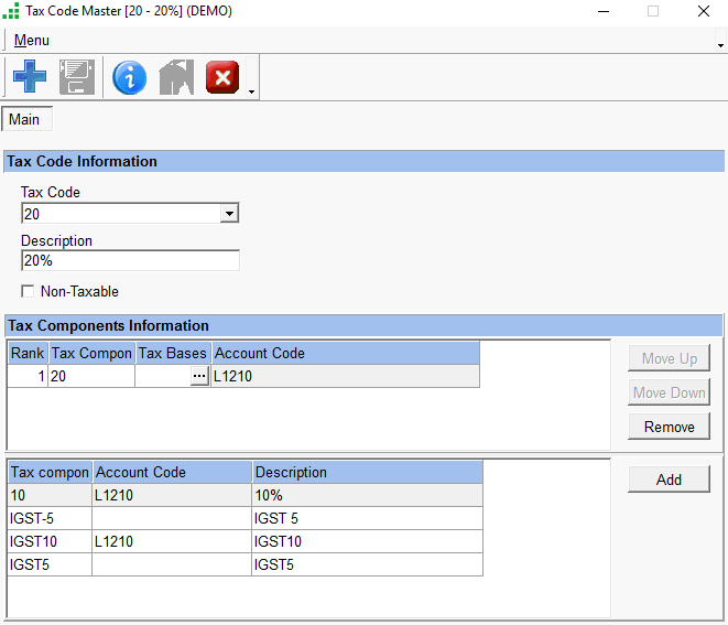 Enter the Tax Code, Description and highlight the Tax Components to be added for this code, and click on the ‘Add’ button. Then remove the Tax Component that was already selected, highlight the Tax Component, and click on the ‘Remove’ button.`