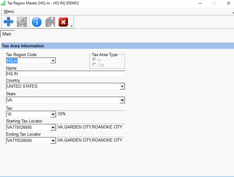 - Enter the Tax Region Code, Name, Country, State, Tax Code, Starting Tax Locator, and Ending Tax Locator, and click on Save.