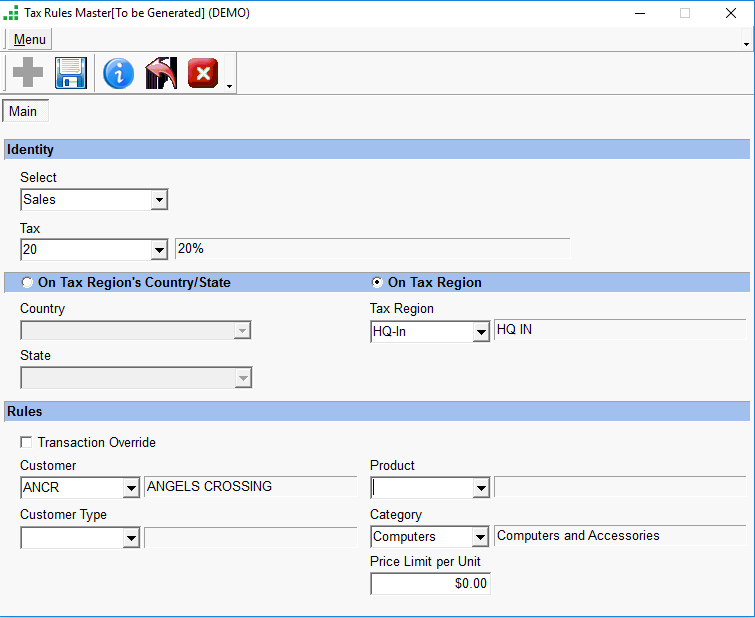 - Enter the Tax Code, whether the Tax should be applied to the Region or the Tax Region, and the Rules for the particular Tax.