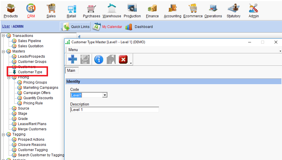 Menu Path: CRM > Masters> Customer Type
