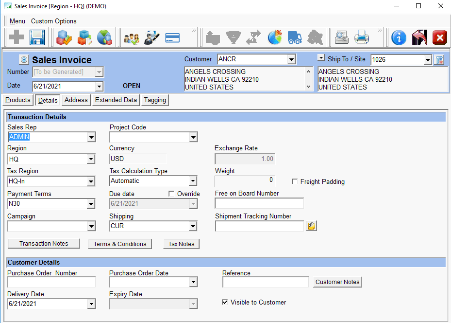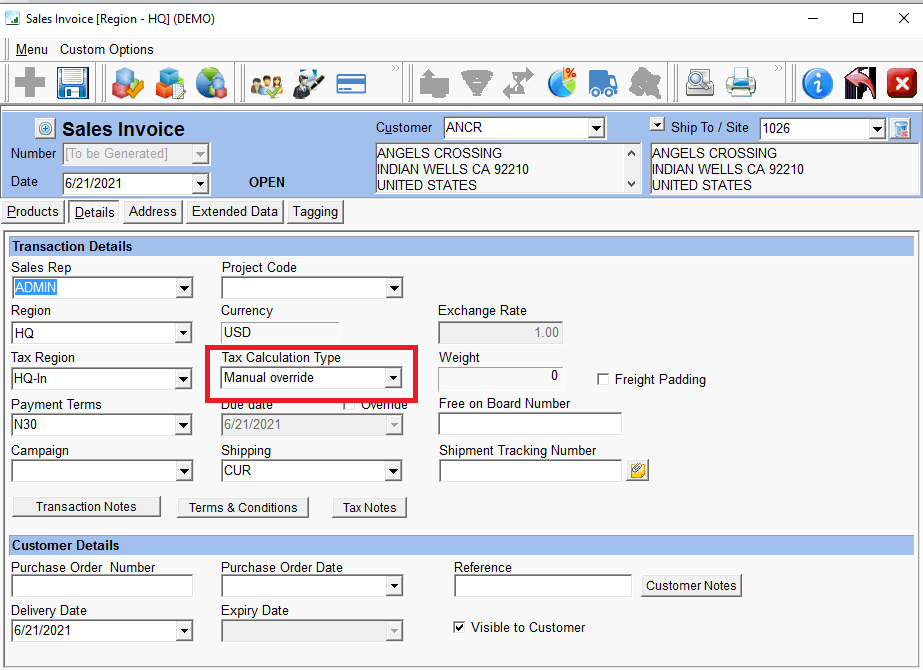 - Select the Customer and Products and the quantity to be shipped and go to the Details Tab. The Region and Tax Region are populated automatically based on the Customer’s address. The Tax Calculation Type is ’Automatic’ by default.