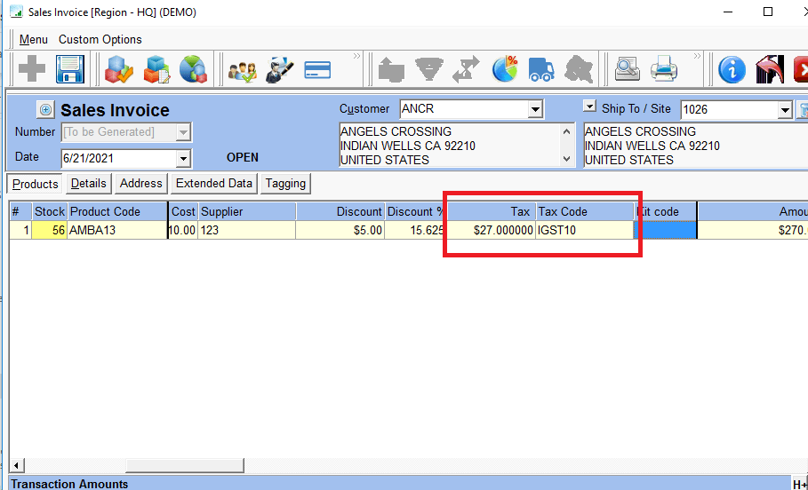 - In the Products Tab, the Tax Code field is populated with the default value of this Tax Region and the Tax amount is calculated accordingly.